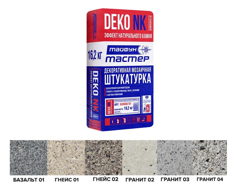 Декоративная мозаичная штукатурка «Тайфун Мастер» DEKO NK применяется для выполнения тонкослойных защитно-декоративных покрытий внутри и снаружи зданий, для устройства защитно-отделочного слоя в системе утепления. При применении декоративной штукатурки снаружи зданий, на цоколях, ограждениях, фасадах и иных конструкциях, подверженных воздействию атмосферных осадков, необходимо обеспечить защиту основания нанесенной штукатурки от увлажнения в процессе эксплуатации путем устройства гидроизоляционных систем, накрывок, отливов и т. д. Декоративная мозаичная штукатурка «Тайфун Мастер» DEKO NK производится в виде композиции, состоящей из двух компонентов: КОМПОНЕНТ А – мешок с композицией крошки натурального и окрашенного кварцевого камня (песок, слюда, блестки), масса 16,2 кг; КОМПОНЕНТ Б – ведро пластмассовое с базой, масса 7,6 кг. Штукатурка выпускается в ассортименте 13 цветовых композиций.Виды основания