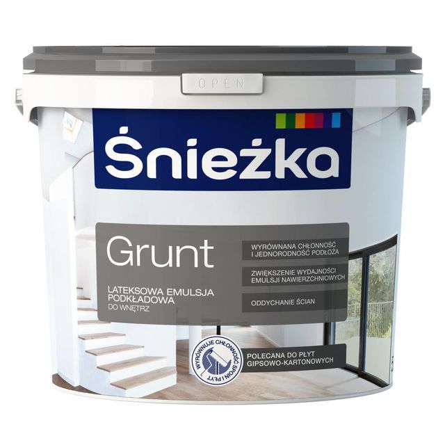 Применение краски Sniezka ГРУНТ значительно снижает стоимость покраски, так как для получения ожидаемого эффекта обычно достаточно одного слоя грунтовочной краски и одного слоя финишной краски. Особенно рекомендуется для первой покраски гипсокартонных листов и оснований с неоднородной фактурой.Область применения: