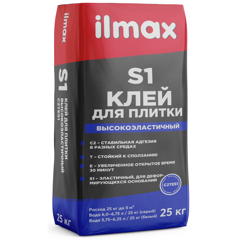 Высокоэластичный плиточный клей ilmax S1 предназначен для приклеивания: плиток керамических, в том числе керамогранитных (ГРЭС), клинкерных, а также кислотоупорных; бетонных плиток и плит; плит из натурального и искусственного камня; стеклянной, керамической и натуральной мозаики. Может применятся для приклеивания крупноформатной плитки с размером стороны более 1 м.