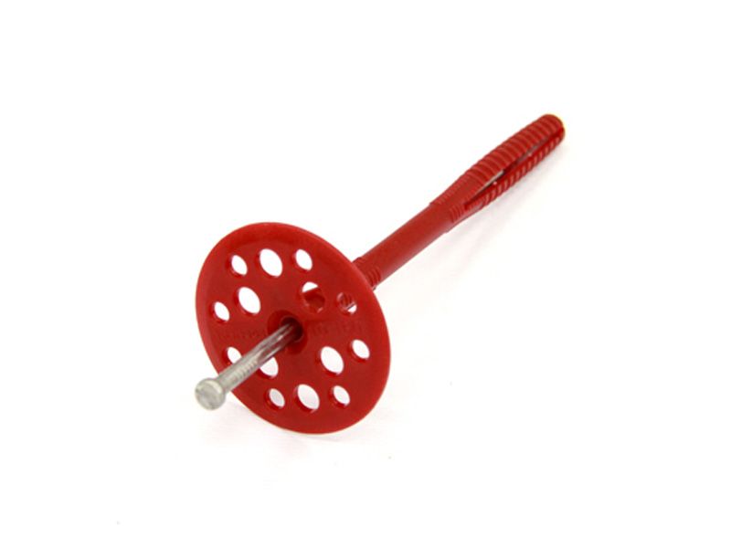 Применяется для крепления утеплителей. Чаще всего на 1 м.кв. идет 5 зонтов. Гвоздь в зонте может быть пластиковым. Его плюс в том, что пластик не так сильно проводит холод, в отличие от металла. Но пластик не так долговечен, поэтому если хочется по максимуму сохранить тепло лучше взять металлический гвоздь с термозаглушкой - это пластиковая накладка на шляпку гвоздя, она помогает сохранить тепло. Но гвоздь с термозаглушкой дороже обычного, поэтому чаще покупают зонты с простыми металлическими гвоздями.